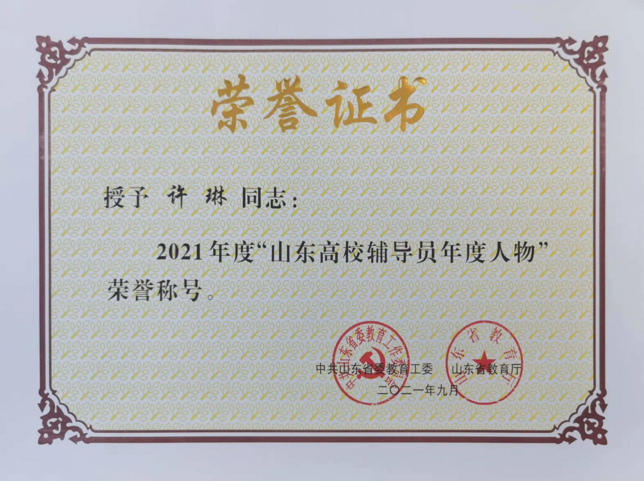 近日,中共山东省委教育工委在全省高校组织开展了2021年度“山东高校辅导员年度人物”“山东高校优秀辅导员”推荐评选活动,经高校选拔推荐、专家评审、网上公示等环节,我校能源与矿业工程学院辅导员许琳荣获2021年度“山东高校辅导员年度人物”荣誉称号。