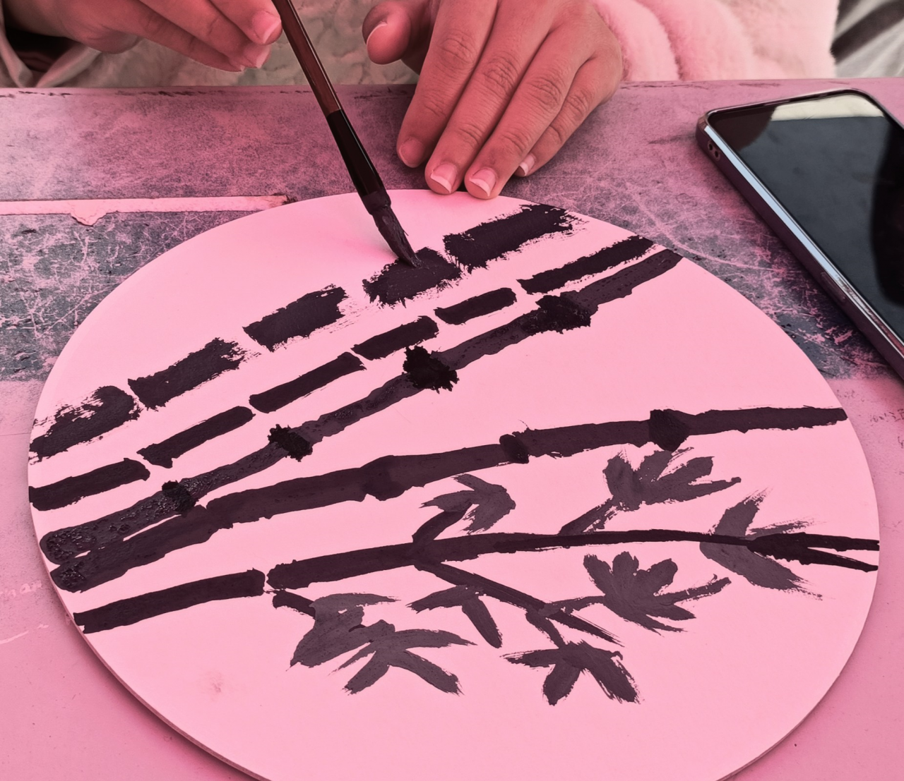 学生在现场体验画扇面
