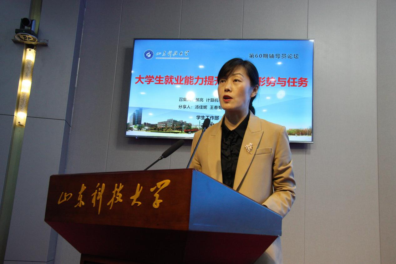 在疫情防控常态化,经济下行压力的大背景下,为了帮助各位老师更好地认识就业形势,进一步做好学校的就业质量提升工作,10月28日上午10点30分,学校在逸夫讲堂举办第60期辅导员论坛,学校特邀智联招聘大学生就业研究院大数据专家汤佳妮老师,计算机学院党委副书记、大学生就业能力提升工作室主持人郝亮副教授以及计算机学院辅导员、工作室成员王春菊为辅导员们做专题报告,论坛由学生工作处副处长孔环主持,青岛校区全体专兼职辅导员参会。