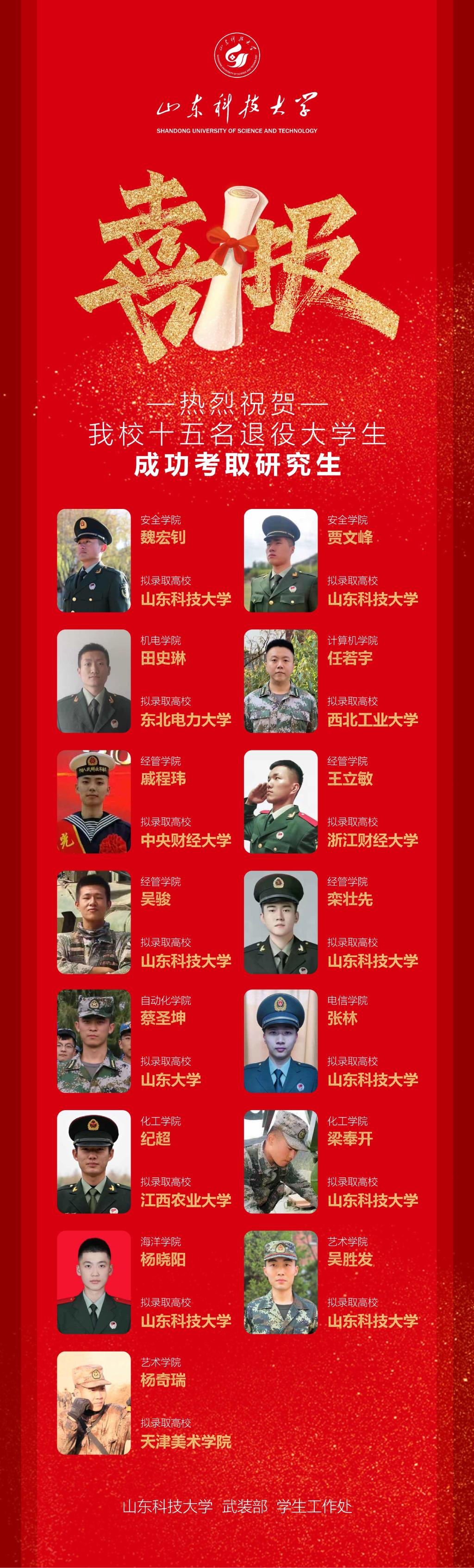 青春逢盛世,奋斗正当时,从部队到校园,从战士到学子,在2022年全国研究生考试中,我校有15名退伍大学生成功考取研究生,分别被山东大学、西北工业大学、中央财经大学、山东科技大学等高校录取,人数创历年新高。