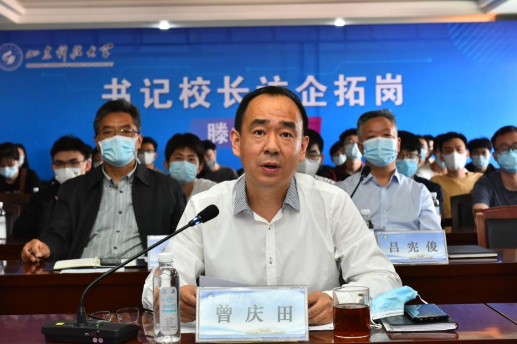 曾庆田介绍了学校发展历史、 和就业创业工作。他表示,滕州是“北辛文化”发祥地,是历史文化名城,人杰地灵,物华天宝。这里产业基础雄厚,机械机床制造企业、国家级高新技术企业和电子商务零售企业众多,同时拥有高端装备、高端化工两个千亿级产业和六个百亿级产业,是广大青年干事创业的阵地,就业创业的沃土。长期以来,学校高度重视与滕州市各级政府、企事业单位的密切合作。目前山东科技大学已与滕州市签订了知识产权战略合作协议,设立了山东科技大学技术转移中心滕州分中心,共建山东科技大学大学生就业创业实践基地、大学生社会实践基地等,进一步推进与滕州市在就业创业、科技成果转化等各领域的合作共赢。通过今天的活动,山东科技大学将进一步创新人才培养模式,依靠政府搭台、企业参与,发挥各方资源优势,把企业需求和企业家智慧融入 和人才培养过程,深化人才培养供给侧改革,深化校政企协同育人,实现校政企合作共赢,为滕州经济社会发展贡献更多科大力量。
