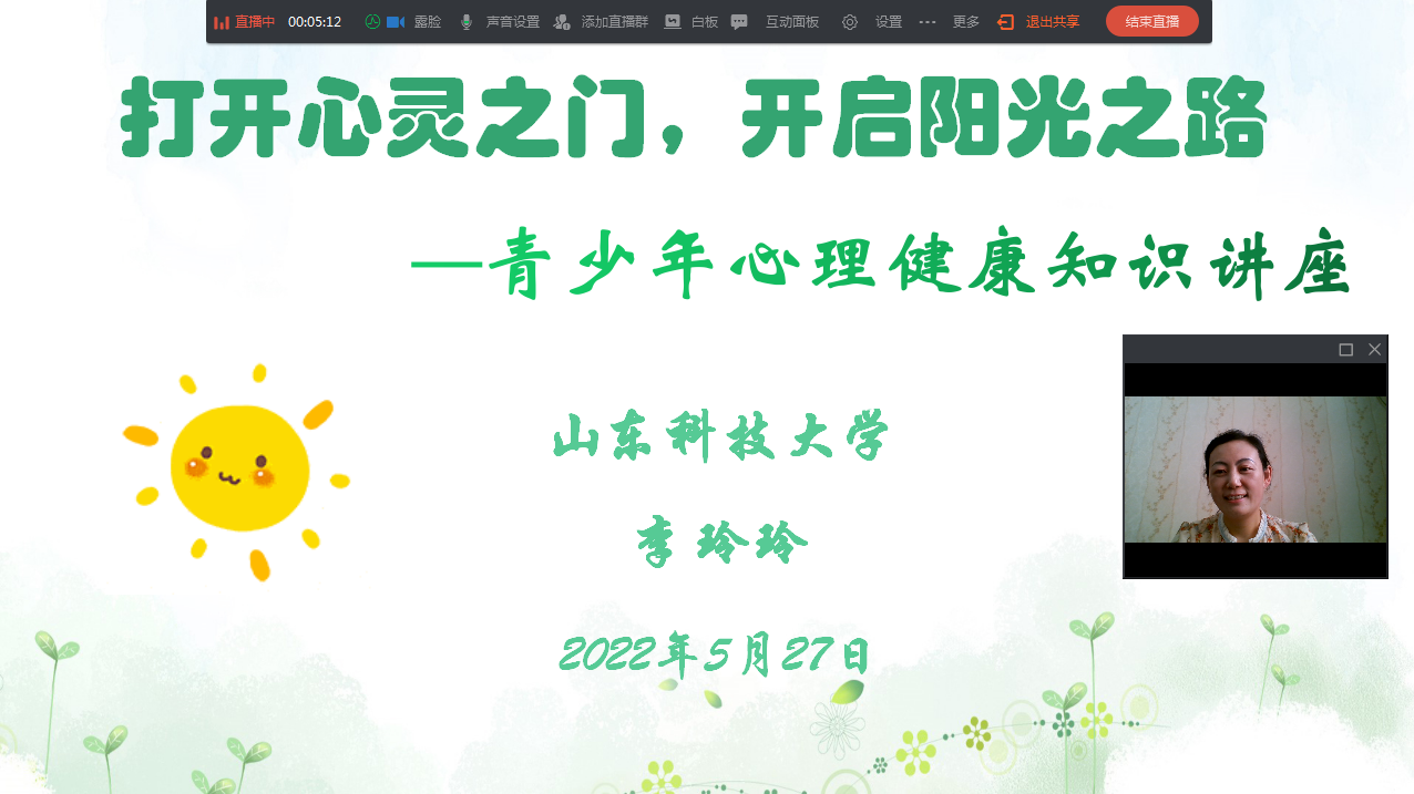 5月27日,根据青岛市教育局“心理专家进校园”工作安排,我校大学生心理健康教育中心咨询师李玲玲为全校500余名初中生开展了以“打开心灵之门,开启阳光之路”为主题的线上心理健康教育讲座。