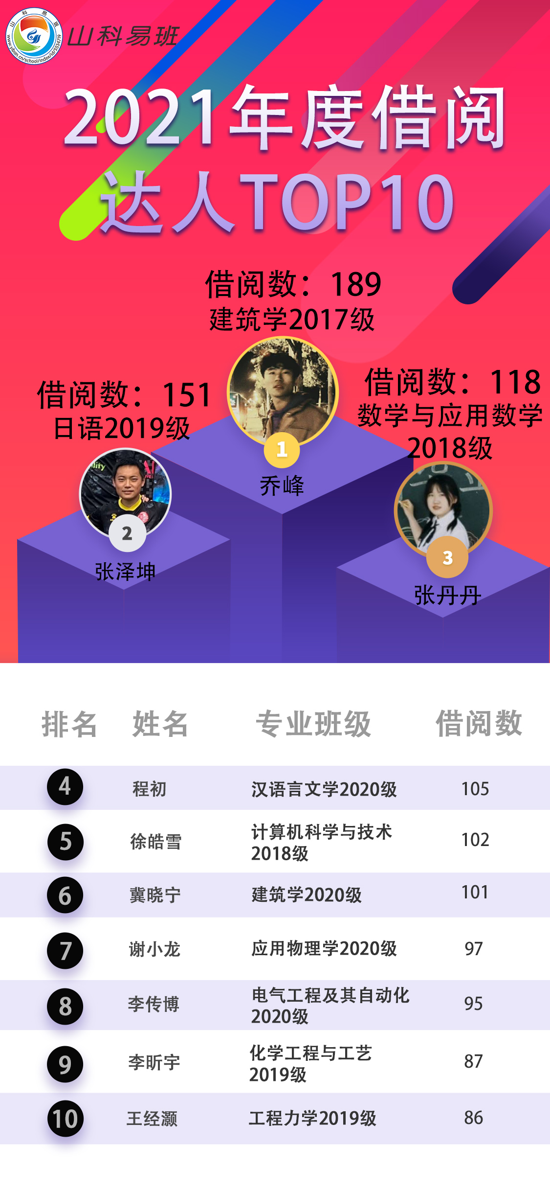 在2021年度借阅达人排名前十位的学生中,土木工程与建筑学院建筑学专业2017级(五年制)的乔峰同学全年累计借书189册,荣获“2021年度借阅达人”。