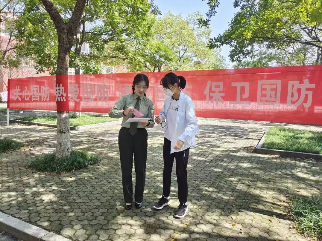 活动期间,还组织学生观看了2022年度全民国防教育万映计划重点推荐影片。通过观看《金刚川》《长津湖》《1921》等红色影片,追忆革命先辈的英雄事迹,感受老一辈的革命精神,汲取前进的力量,激发同学们学习党史军史的爱国热情。9月17日,大学生国防教育联合会、国防先锋营的成员们在校内设置国防知识教育宣传点,利用条幅、宣传单页向师生讲解全民国防教育日的来历、目的等国防知识,让国防教育走出课堂,走进日常生活,进一步增强师生的国防意识。