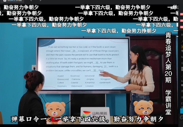 11月11日晚,山科易班学生工作站举办第20期“你好!青春追梦人”之学霸讲堂直播分享活动,活动邀请了山东科技大学外国语学院学霸助教团成员武楠楠做客直播间,为大家线上分享英语四级阅读的解题技巧。直播当天,人气值达1.1万人次。