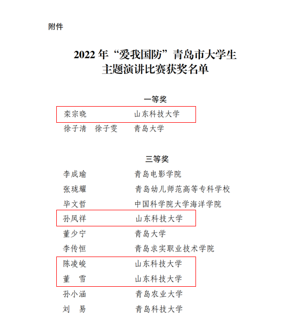 近日,青岛市委宣传部公布了2022年“爱我国防”青岛市大学生主题演讲比赛获奖情况,我校选派4名学生参赛并获佳绩。自动化学院栾宗晓荣获一等奖并推选参加省赛,经管学院孙凤祥、外语学院陈凌峻、材料学院董雪分获三等奖,学校获评“优秀组织奖”,于喆、杨洪骞获评“优秀指导教师奖”。