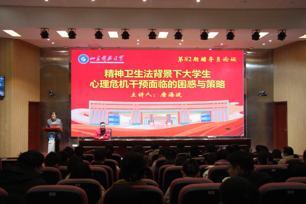 此次论坛邀请到知名心理危机预防和干预专家、中南大学教授唐海波作专题报告,论坛由学生工作部(处)副部(处)长靳凯主持,三校区全体辅导员参加,在青岛校区设主会场,在泰安、济南校区设视频分会场。