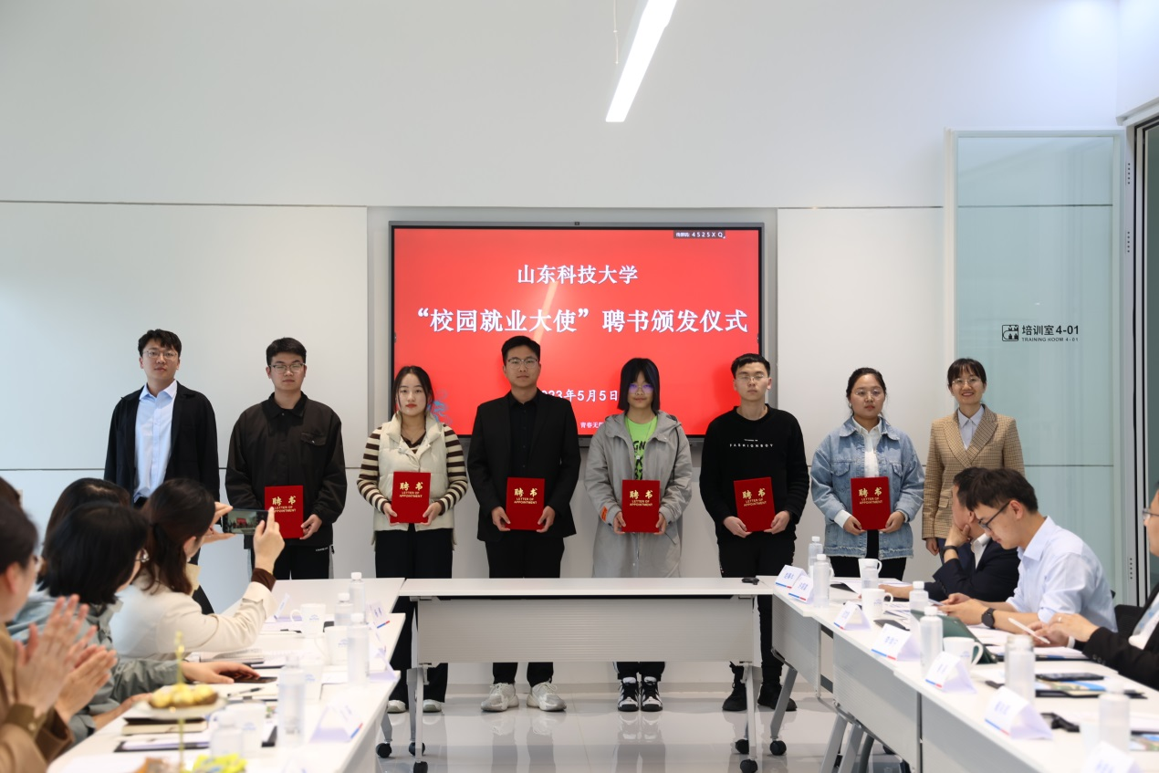 会上,淄博市人力资源和社会保障局和山东科技大学签署《人才引进合作协议书》。山东科技大学与英科集团共建“就业创业实践基地”揭牌。与会嘉宾为6名山科学子颁发“校园就业大使”聘书。英科医疗科技股份有限公司、山东新华医疗器械股份有限公司、鲁泰纺织股份有限公司、山东金晶科技股份有限公司、山东中科际联光电技术研究院、山东胜越石化工程建设有限公司6 家单位依次介绍企业发展和人才需求情况。