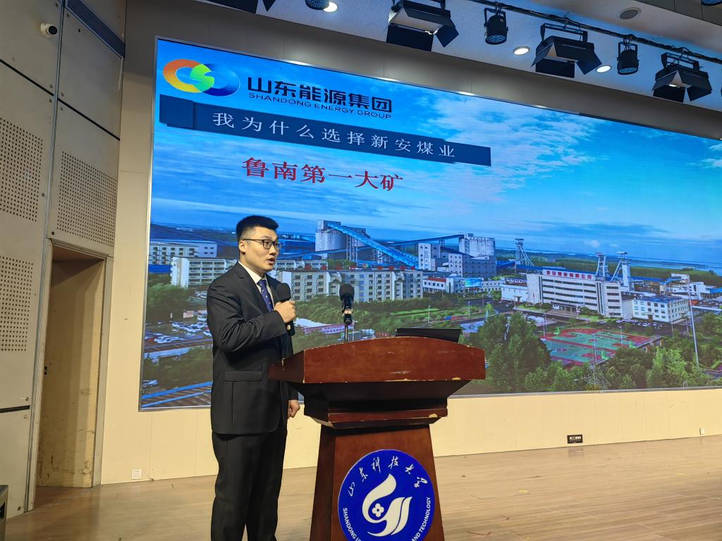 “我在2015年带领团队建成全国第一条‘永磁电机+变频器+芳纶胶带+高分子托辊+热浸锌机架’高可靠带式输送机……”“我在工作期间不忘学习,获得发明专利1项,发表论文3篇,中国煤炭协会成果鉴定1项……”在山东能源集团宣讲会上,专门设置“‘友’话‘职’说”环节,三位校友侃侃而谈,在介绍自己就业经历和感悟的同时,也为学弟学妹提供宝贵的就业建议。