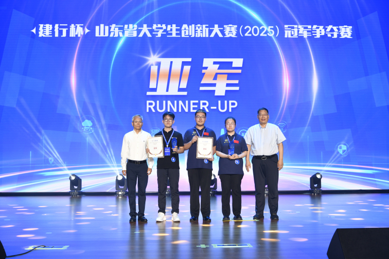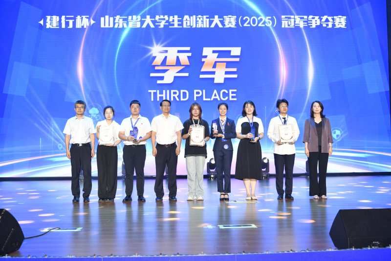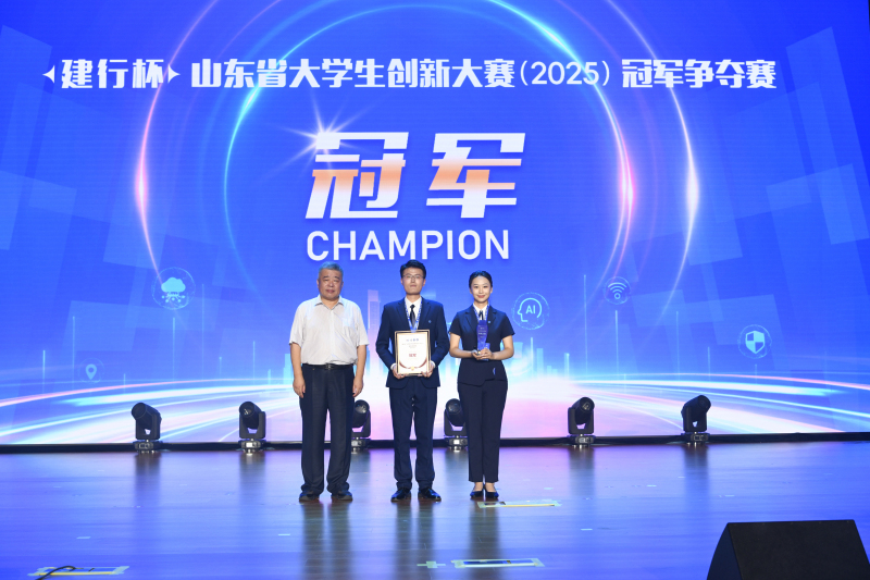 经角逐,山东科技大学“守土有方——煤基固废利用助力黄河流域矿区耕地保护新方案”项目斩获“建行杯”山东省大学生创新大赛(2025)决赛冠军,山东工艺美术学院“算衍天工”项目、哈尔滨工业大学(威海)“航链卫海——万里海疆守护者”项目获亚军,青岛大学“光碘瘤消——治疗宫颈癌前病变的碘化吲哚菁绿光敏剂凝胶”项目、山东建筑大学“‘桃’金密码——沂源革命老区金黄金桃产业价值升级开拓者”项目、山东大学“智检芯生——基于OCT技术的芯片封装三维检测设备”项目获季军。与会嘉宾现场为冠、亚、季军队伍颁发奖杯和证书。