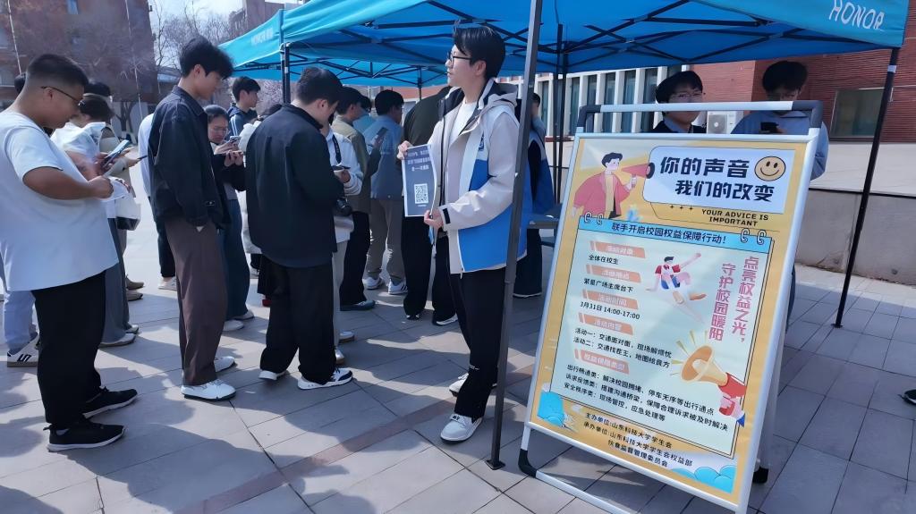 3月31日,山东科技大学第六期“你的声音,我们的改变”校园满意度调查活动在繁星广场开展。活动以“智行校园”为主题,由校学生会权益部举办,面向全体学生征集交通优化建议,助力校园出行环境提升。