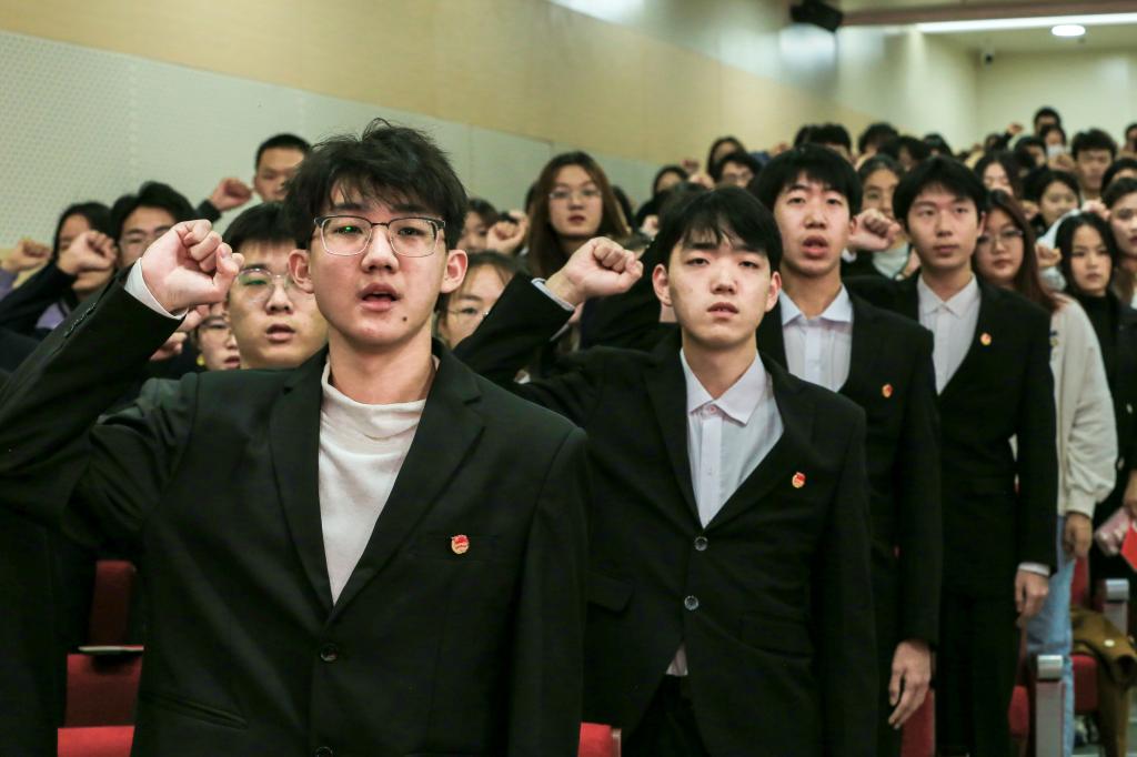 马鹤向新团员代表颁发团章和团员证,各学院团委负责人为新团员代表佩戴团徽。新团员在校团委兼职团干部陆星宇的带领下,面向团旗庄严宣誓,在高喊出自己名字的那一刻,新团员们热血澎湃,每个人身上肩负起了光荣而艰巨的使命。