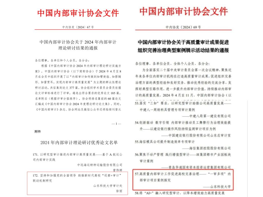 图23、1篇论文、1个案例分别获中国内部审计协会“2024年内部审计理论研讨优秀论文”“高质量审计成果促进组织完善治理典型案例”