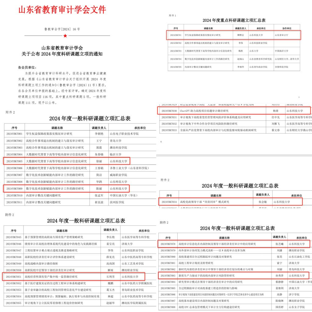 2024年立项省审计厅重点课题1项,立项省统计局重点课题1项并结题,立项省教育审计学会重点课题1项、一般课题7项。进一步提升了学校内部审计工作的理论研究水平和实践能力,推动学校内部审计工作全面规范、全面提标。