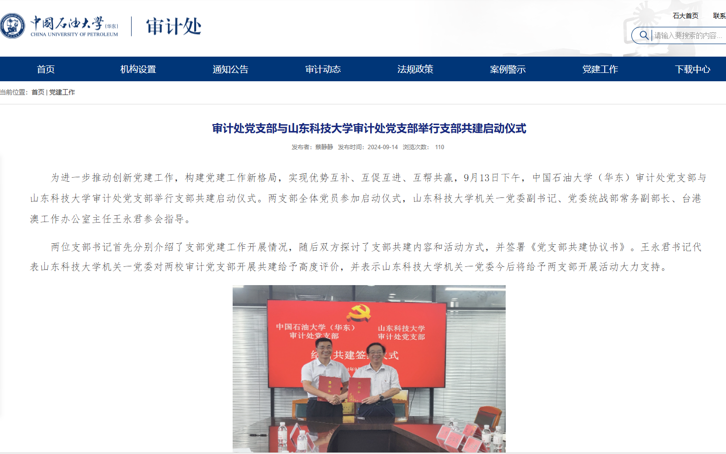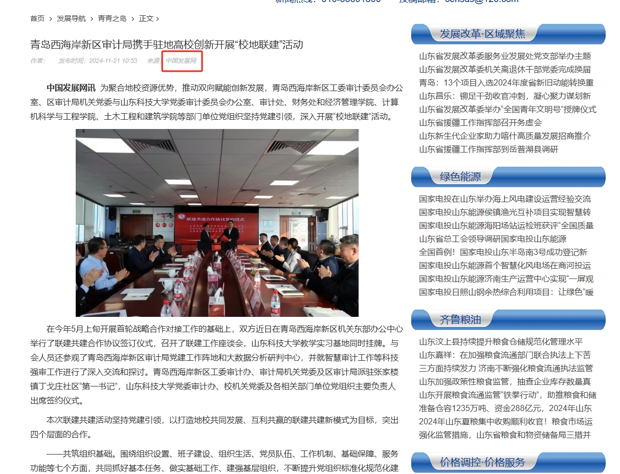 9月13日,与中国石油大学(华东)审计处党支部举行支部共建启动仪式,签署党支部共建协议书;10月30日,与西海岸新区工委审计办签署了联建共建合作协议。以联建共建为契机,促进双方在党建和业务领域的经验交流与合作,不断打造党建与业务深度融合“链上党建”品牌,其相关活动被中国发展网、青岛审计等媒体报道。