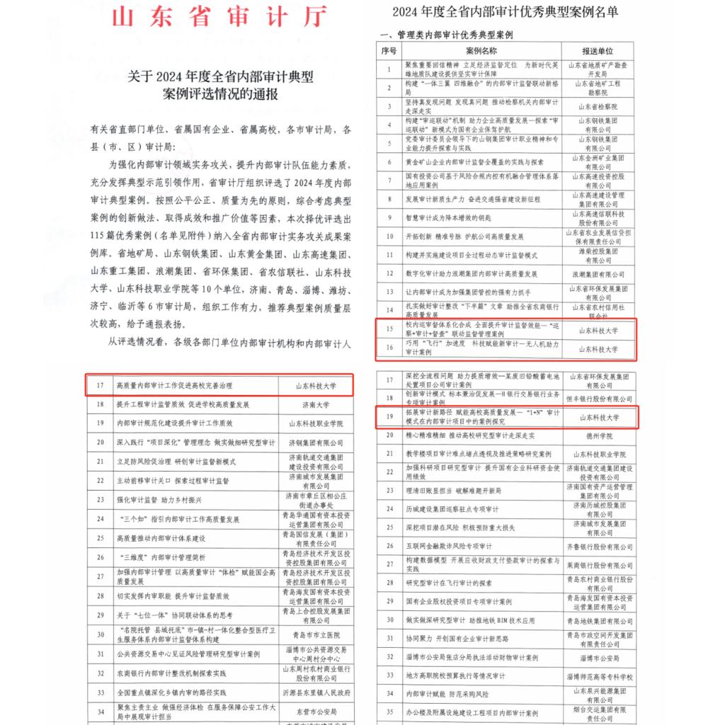 全年高质量完成8位干部经济责任审计,完成省教育厅安排的《山东科技大学对照审计发现问题开展自查自纠情况报告》《与社会力量合作经济事项退出机制的建立与落实专项审计报告》《学生权益保障政策落实专项审计报告》等9项专项审计,正在开展7位干部经责审计和1项专项审计。受省教育厅委托完成山东科技大学教育发展基金会、滨海学院教育发展基金会专项审计工作。受教育厅委托,牵头和学校纪委完成对王台某初级中学乱收费事项的审核工作。主动将审计监督与其他多种监督体系相融合,推行1+N审计模式,凝聚协同监督合力,推动审计监督“全覆盖”。其经验做法被省内高校纷纷借鉴学习,省审计厅向审计署内审司做介绍。