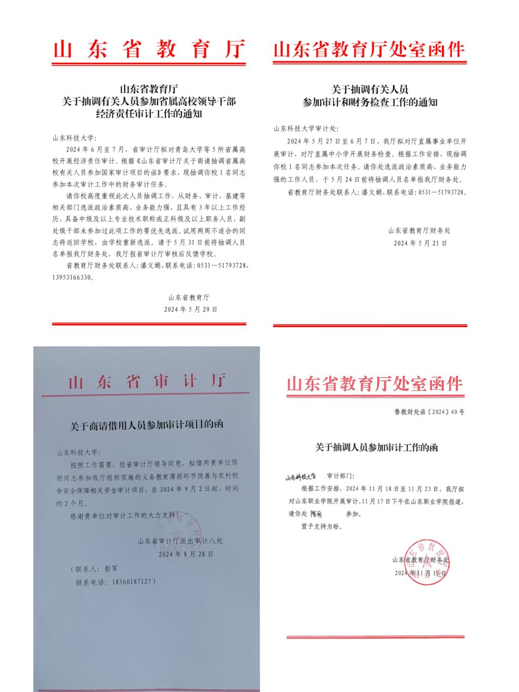 开展审计队伍业务能力提升工程。先后派出4人次参加省教育厅、审计厅的审计项目5项;21人次参加省教育厅、教育审计学会组织各类培训会;2024年获评“全省教育审计先进工作者”1人、“全省教育审计优秀信息员”1人、“2023年度校安全工作先进个人”1人、“山东省教育审计智库专家”1人、“山东省教育审计中青年骨干人才”3人。2人获得国际注册内部审计师(CIA)证书、1人通过审计专业中级资格考试。省教育厅、中国石油大学、齐鲁工业大学等6单位(高校)审计同仁来校交流审计工作。