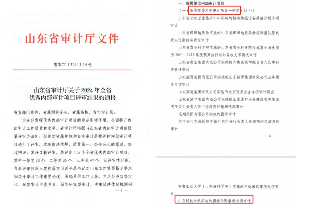 在2024年10月召开的全省内部审计工作推进会上,我校审计工作做法被编入会议交流材料汇编,是全省唯一入选高校;一个审计项目获评审计厅“2024全省优秀内部审计项目一等奖”,四个审计案例获评审计厅“2024年度全省内部审计优秀典型案例”,因年度专项审计工作成效突出省教育厅予以通报表扬。一篇论文获中国内部审计协会“2024年内部审计理论研讨优秀论文”,一个审计案例获中国内部审计协会“高质量审计成果促进组织完善治理典型案例”,荣获“2023年度全省教育审计先进集体”荣誉称号。
