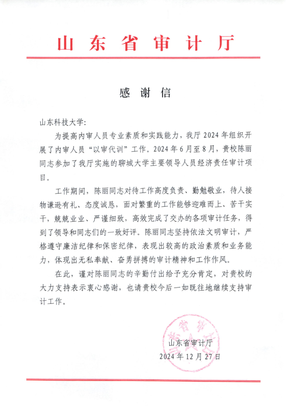 山东省审计厅2024年组织开展了内审人员“以审代训”工作,6月至8月,我校审计处陈丽同志参加了山东省审计厅实施的聊城大学主要领导人员经济责任审计项目。12月27日,山东省审计厅向我校发来感谢信,感谢学校对审计厅工作的大力支持,对陈丽同志的辛勤付出给予充分肯定。