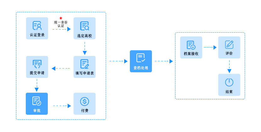 学校查档管理人员对提交的查档申请进行审核,根据查档申请表,管理员能够找到相关档案,通过审核用户则可进行付费,否则申请会被驳回。驳回后用户可根据驳回原因,修改查档申请表,进行再次提交申请。