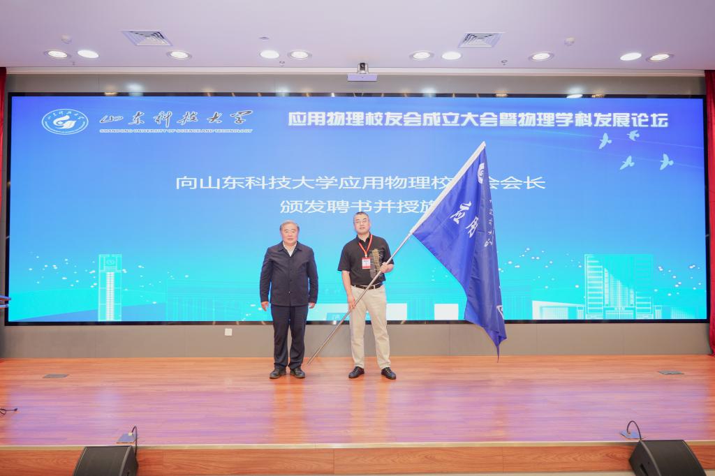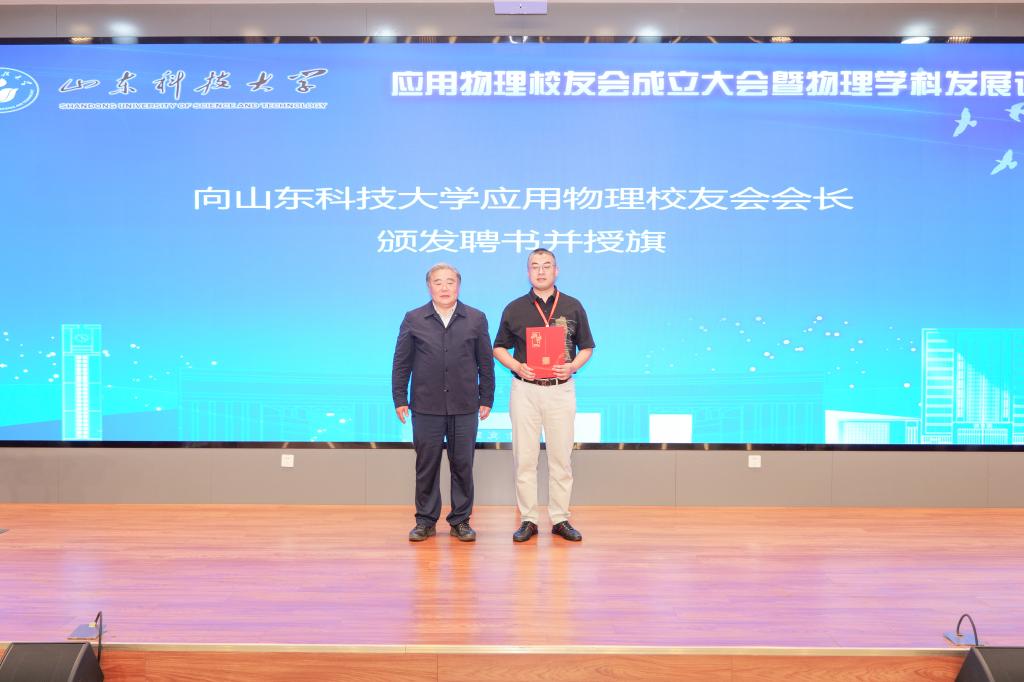 姚庆国向首任会长和校友会顾问颁发聘书并授校友会会旗,王晓东向副会长颁发聘书,徐玲平向秘书长、副秘书长颁发聘书。