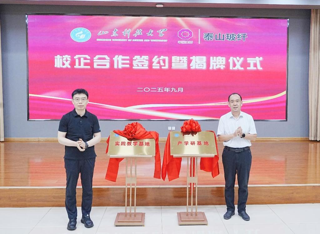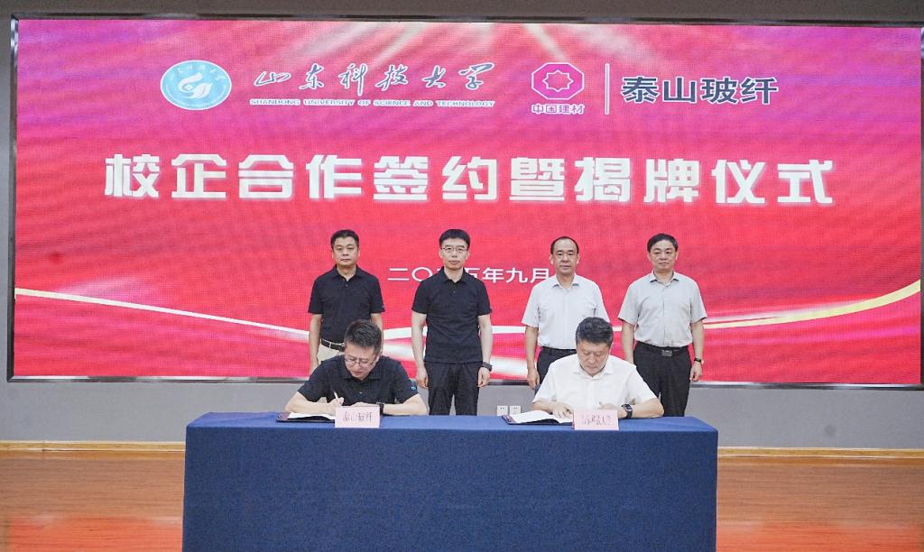 9月1日,学校与泰山玻璃纤维有限公司签署紧密合作协议。党委副书记、校长曾庆田,党委常委、副校长徐方全,泰山玻璃纤维有限公司总经理刘利锋、副总经理徐永军参加会议并致辞。曾庆田和刘利锋共同为“山东科技大学实践教学实习基地”“山东科技大学产学研基地”揭牌。合作发展处处长王晓东与泰山玻璃纤维有限公司总经理助理潘春呈代表双方签署《山东科技大学与泰山玻璃纤维有限公司紧密合作协议》。