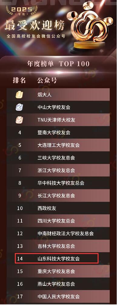 近日,校友工作研究权威平台“校友工作研究”正式发布了《2025年度校友会微信公众号榜单》。山东科技大学校友会微信公众号凭借持续优质的内容运营、广泛深入的校友连接与显著提升的平台影响力,在多项权威评选中斩获佳绩,综合实力与品牌美誉度获得全国性认可。