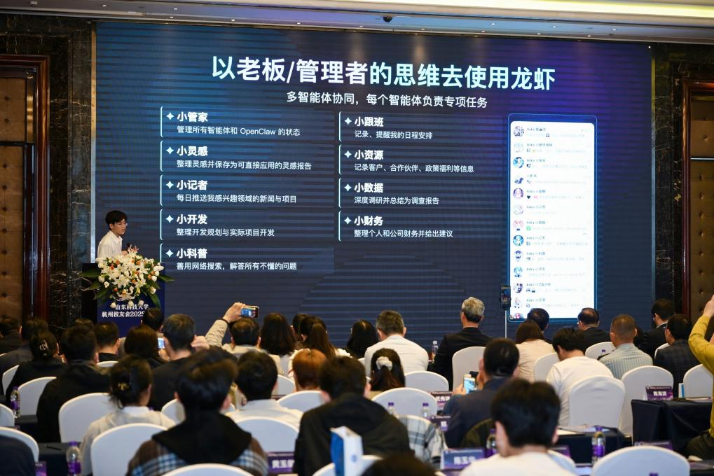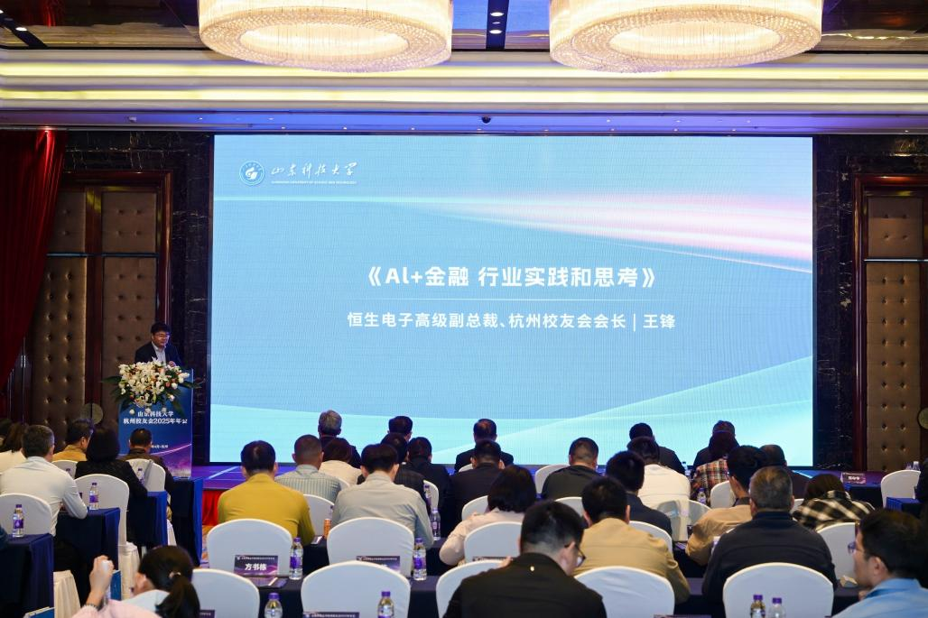 在主题分享与交流环节,多位行业大咖围绕 “AI+” 主题带来前沿分享,为校友们带来思想启发与实践参考。恒生电子高级副总裁、杭州校友会会长王锋以《“AI+金融”行业实践和思考》为题,结合金融行业数字化转型实践,深度剖析了AI技术在金融领域的落地路径与未来趋势;1992级管理专业康立波校友之子康智豪带来《从0到1 AI落地实战赋能企业》的分享,从实战角度拆解了AI技术赋能企业发展的全流程,为校友企业数字化转型提供了可借鉴的方案;苏州能量侠公司董事长、苏州校友会副会长李军委分享了《我的使命与我的奋斗》创业故事,以自身创业历程激励广大校友勇毅前行、逐梦远方。