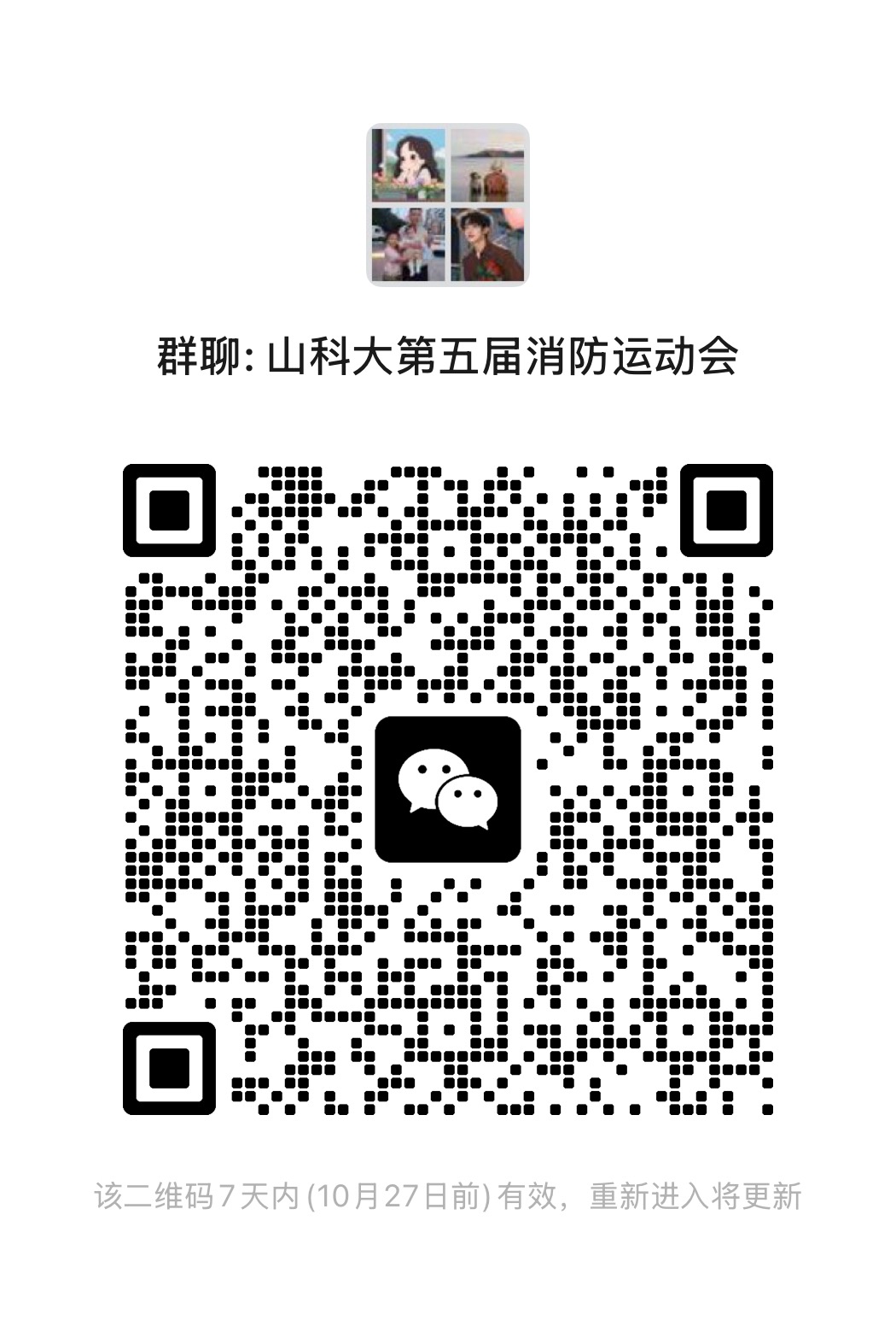 4.为保证本次比赛顺利开展,请教工队伍、学生队伍领队人员扫描下方二维码加入微信群“山科大第五届消防运动会”。(进群后请及时修改备注:单位+姓名+联系方式)