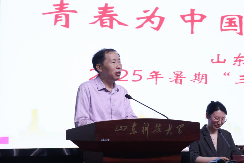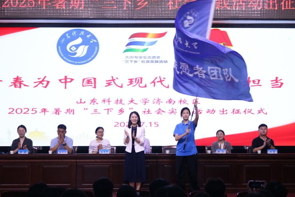 近日,济南校区2025年暑期“三下乡”社会实践活动出征仪式在图书馆报告厅举行。共青团天桥区委书记陈亚楠,济南校区党委委员、电气信息系党总支书记兼学团工作部主任、学生党总支书记毛庆东出席,校区相关部门负责人、全体学生工作干部及“三下乡”社会实践重点团队师生代表100余人参加。