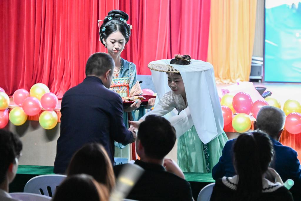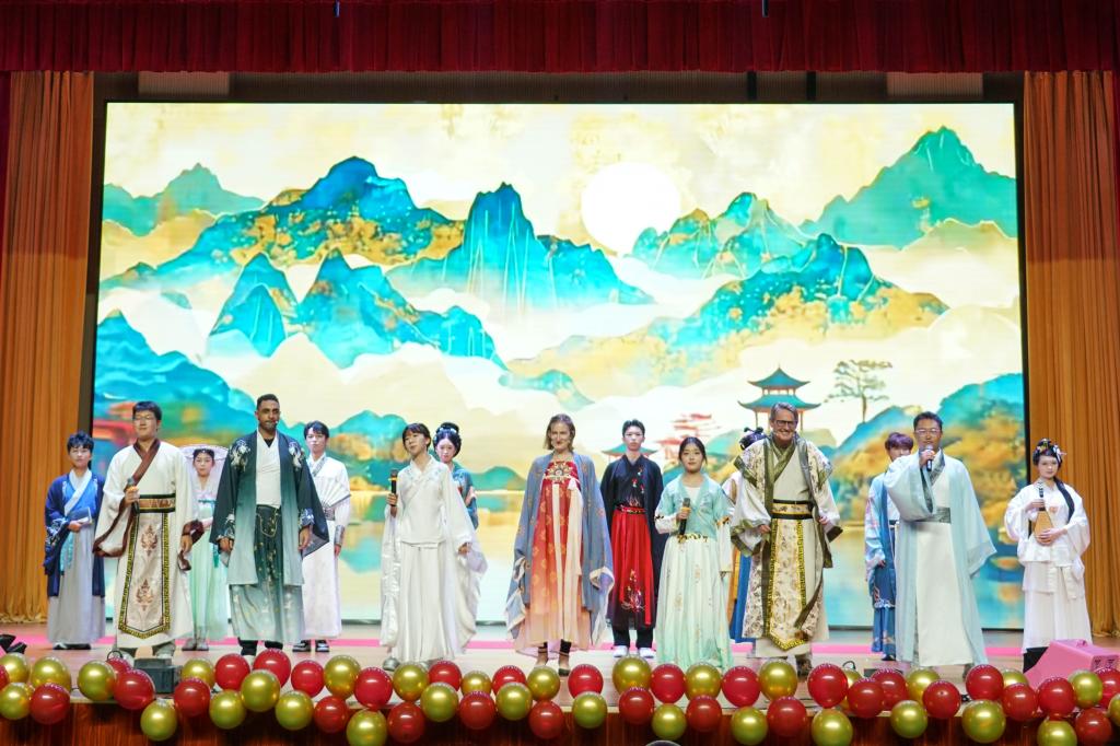 晚会中,由中外师生共同演绎的《唐宋复原秀》成为一大亮点,将现场气氛推向高潮。节目深度融合我校中外合作办学的特色,外教与学生一同身着典雅唐宋汉服登台,以一曲中英文《水调歌头》实现跨越语言的文明对话,并向观众席分发象征团圆的中秋月饼,不仅传递了“天涯共此时”的美好寓意,更以一份甜蜜搭建起师生之间、中外之间情感连接的桥梁。现场欢声笑语、温情涌动,生动诠释了“中外融合、师生同心”的校园文化氛围。(文:徐乐,摄影:冯可欣、魏子格、潘昱曦、江钊宇、赵嘉懿、孟繁棋、李芃菲)
