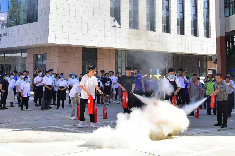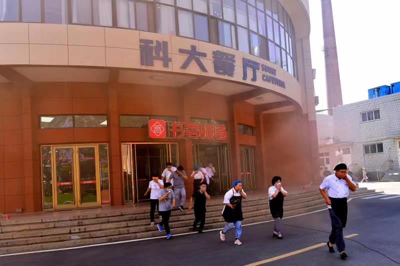 此次演练活动模拟学校餐厅一楼厨房因电气线路短路故障引发火灾的消防疏散场景,随着橘黄色的浓烟在餐厅门口升起和消防警报响起,餐厅内师生员工依照逃生规范,依次从各楼层有序撤出并迅速转移到餐厅东小操场。随后,在现场主持人的指导下,演练人员学习了灭火器的正确操作规程,并使用灭火器进行了灭火演练。