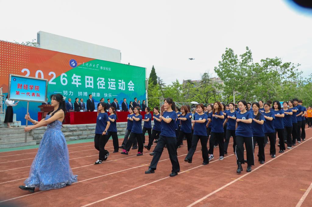4月16日,泰安校区2026年田径运动会在西校园运动场开幕。校党委常委、副校长徐方全,大会主席团成员出席开幕式并在主席台就座。开幕式由公共课教学部主任郭秀荣主持。