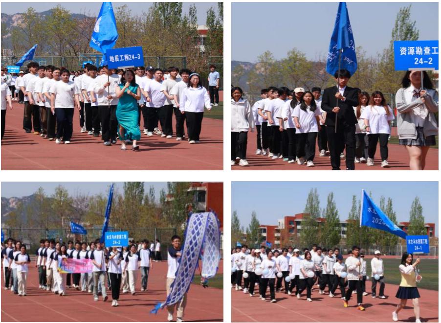 伴随激昂的《运动员进行曲》,国旗护卫队以挺拔身姿擎旗入场,在绿茵场上划出一道红色的行进线,正式拉开了本次运动会的激情序章。2024级8个班级代表方队紧随其后,他们服装统一、步伐整齐,以创意造型和响亮口号彰显地科学子积极向上的风貌。