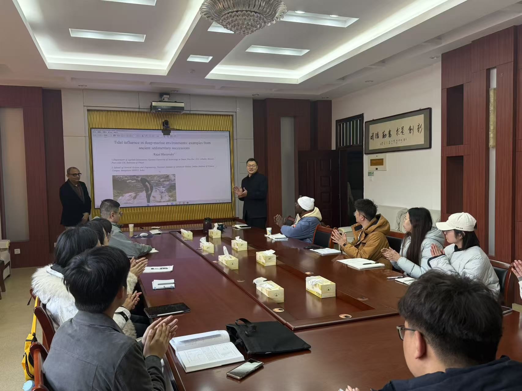 师生们围绕潮汐韵律层的野外识别难点、震积岩与其他沉积构造的区分方法、深海地质记录的研究手段等问题,开展了深入研讨。Rajat Mazumder教授结合自身科研经历,逐一细致解答,针对不同研究方向的师生给出了针对性的研究建议,现场学术氛围浓厚,交流探讨热烈。