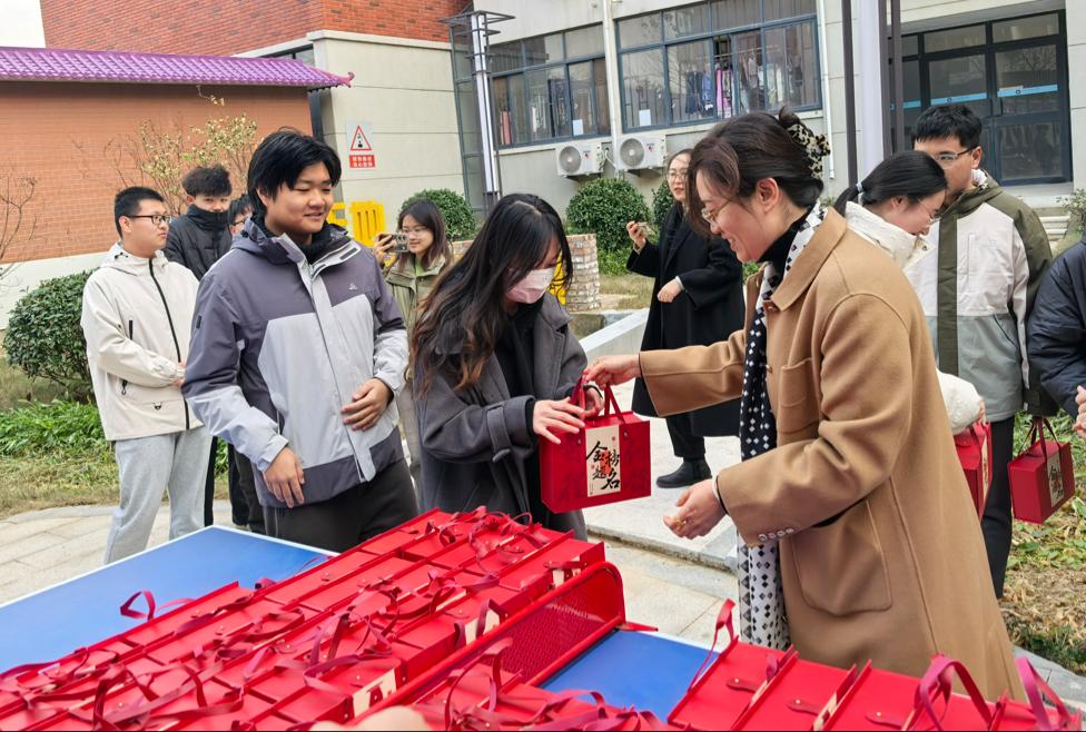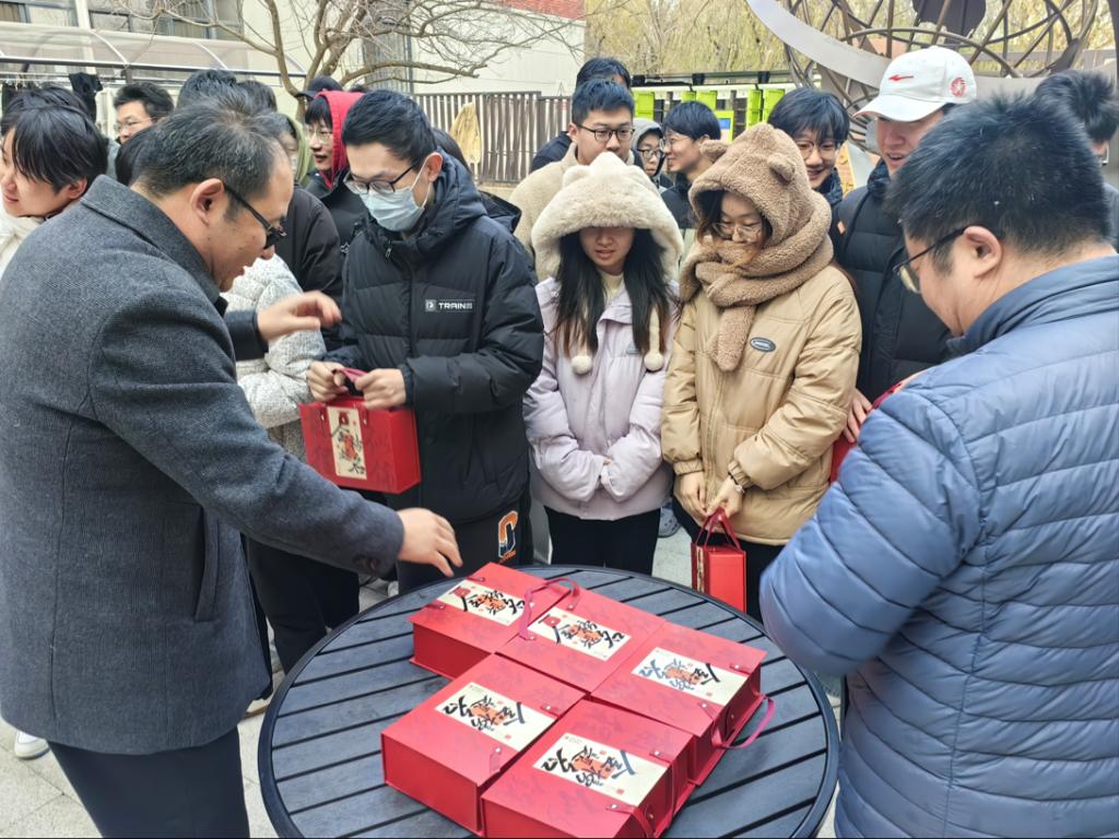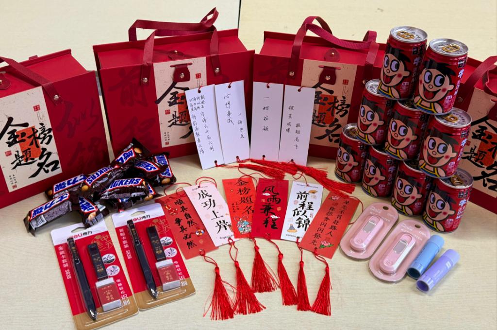 随后,老师们为考研学子送上学院精心准备的“金榜题名”考研大礼包。每一份大礼包内包含“连中三元”涂卡文具套装、“旺气冲天”旺仔牛奶、“牛气冲天”士力架糖果以及“考研必胜”手写祝福书签,饱含了学院对考研学子们浓浓的关爱和殷切的期盼,希望考研学子平安如意,金榜题名!