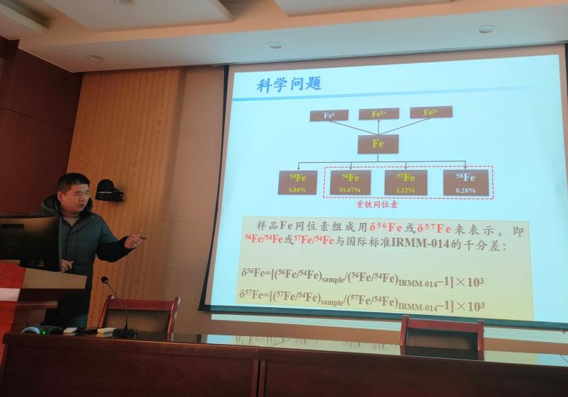 本次讲堂邀请魏友卿老师作报告,题目为“富铁矿物的铁同位素分馏研究——以华北克拉通大庙铁矿为例”。从对已有铁同位素研究资料分析,到提出科学问题“氧逸度变化是否为铁同位素分馏的必要条件”,魏友卿以华北克拉通大庙铁矿中的富铁矿物为典型案例,详细讲解了研究设计、数据采集与分析的全过程。随后,通过详实的实验数据和严谨的逻辑推理,否定了氧逸度变化在矿物中铁同位素分馏的必要性。
