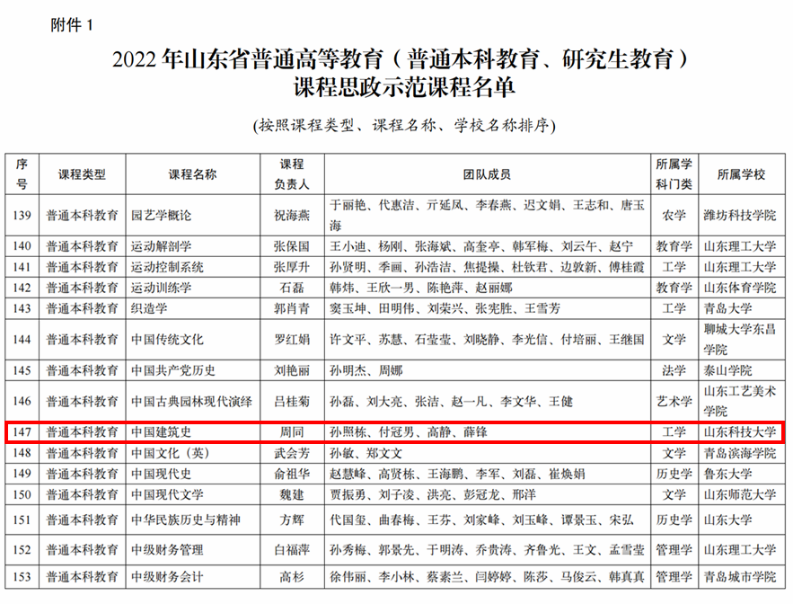 近日,山东省教育厅公布了“普通高等教育课程思政示范课程名单”,我院建筑规划系周同老师主持的《中国建筑史》课程喜获省级课程思政示范项目(项目组成员:周同、孙照栋、付冠男、高静、薛锋),成为我院首个获此项目的课程。这是《中国建筑史》自2021年获得山东省本科一流课程以来,在课程建设方面取得的又一重要成果。