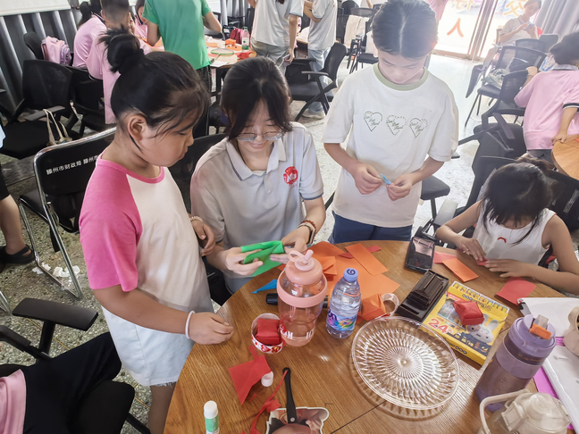 宣讲结束后,活动室里暖意融融。队员们与困境儿童围坐一起,共同开启一场红色手工之旅。拼图板上,天安门的红墙金瓦与南湖红船的剪影渐渐清晰,孩子们指尖轻触拼图块,队员们便轻声讲述红船启航的故事;彩纸上,五角星在折痕间绽放光芒,小小的军帽经一双双小手摆弄成形,队员们手把手教着折法,顺带讲起红军战士的英勇事迹。“这是北京的天安门!”“红船是我们的‘宝贝'!”孩子们的惊叹声此起彼伏。一拼一折间,红色印记悄然烙进童心,队员们用陪伴与互动,让红色文化在欢声笑语中浸润成长。
