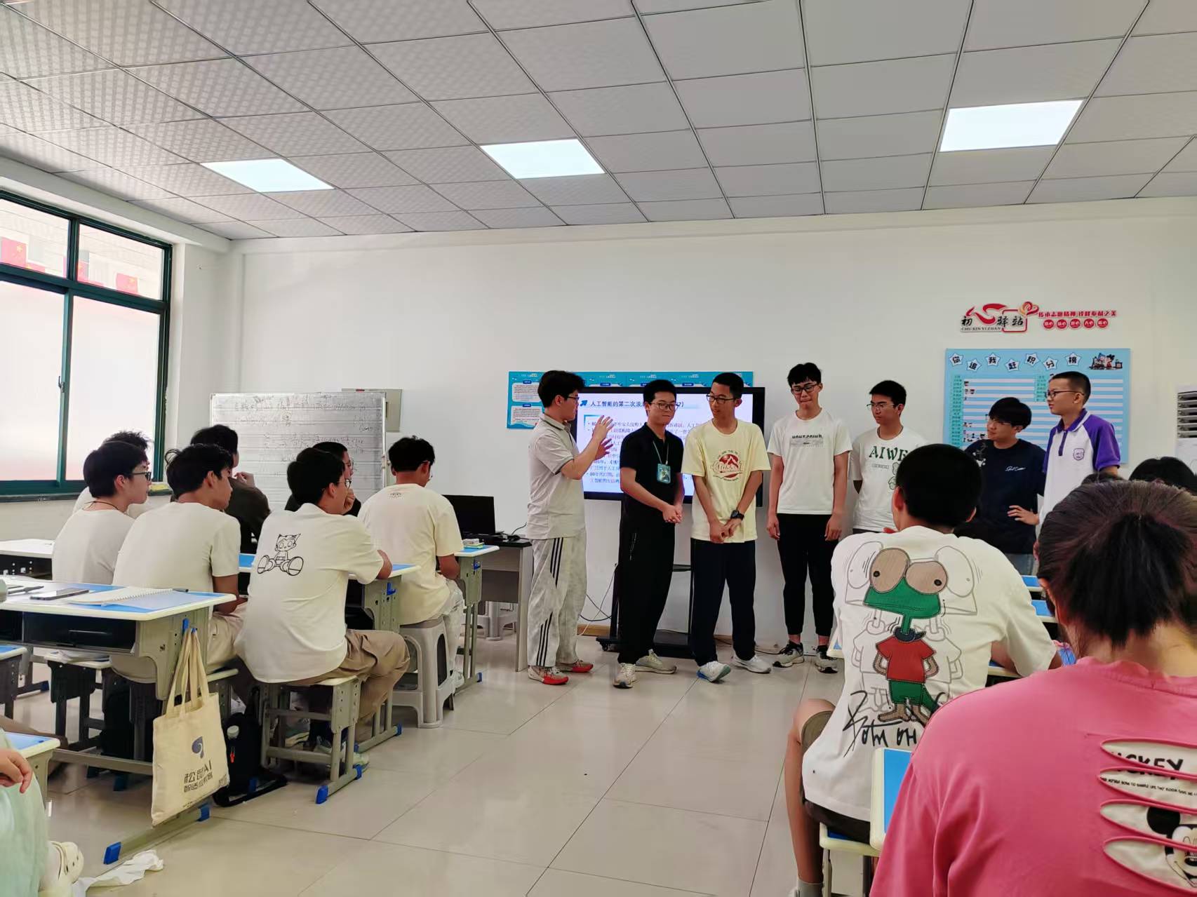 互动环节中,当1950年图灵测试的历史照片出现在屏幕上时,“图灵卧底”游戏随即展开。三名同学分别扮演Siri、小爱同学和ChatGPT,其余同学通过提问来辨别“卧底”身份。游戏过程中,同学们积极思考、踊跃发言,现场气氛热烈。这一环节不仅让同学们直观理解图灵测试的核心思想,更培养他们的逻辑推理能力和团队协作精神。随后,在讲解人工智能发展的“三次浪潮”及神经网络原理时,“神经传递接力赛”将课堂推向高潮。同学们分成两组,通过“捏肩+踮脚”的非语言方式传递动作指令,并完成正向传递与反向纠错。这一活动生动模拟了神经网络中信息传递与反馈的过程,使同学们在轻松愉快的氛围中掌握了复杂的技术概念。