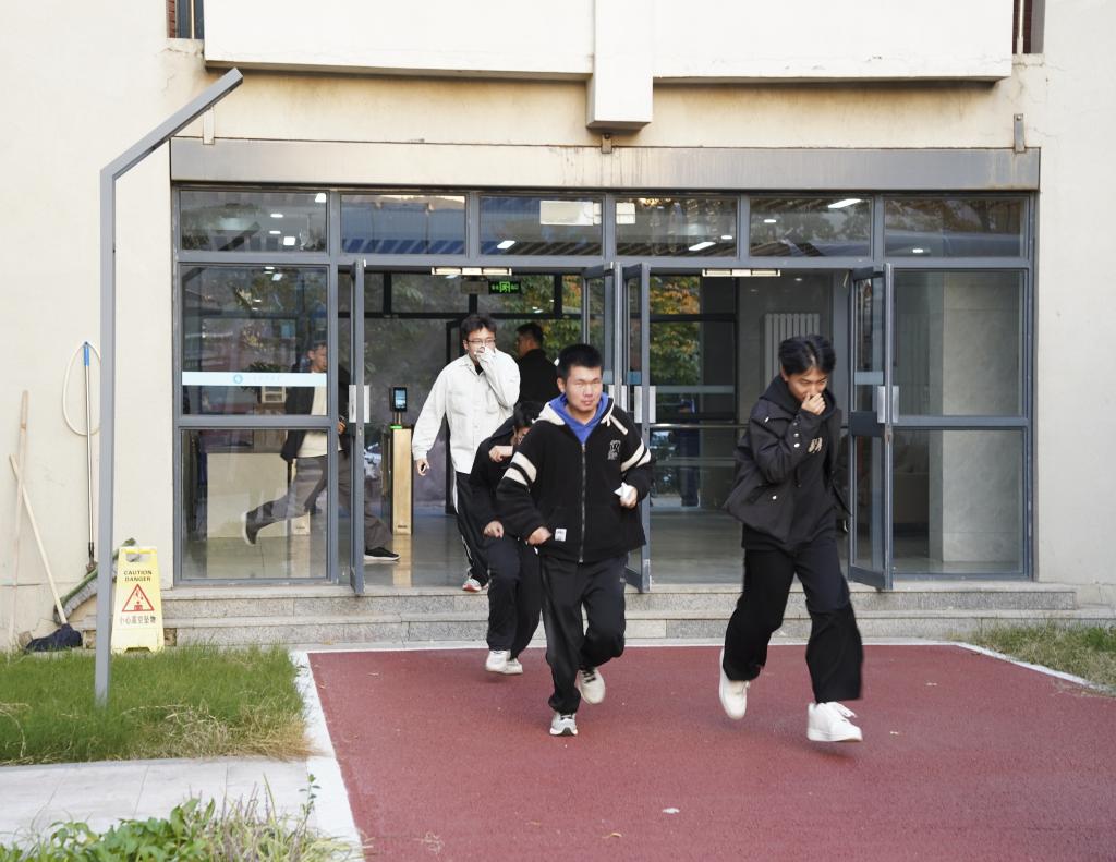 消防报警声在公寓楼内响起,应急疏散环节正式启动。听到警报后,师生们迅速反应,按照预案要求,用湿毛巾捂住口鼻,弯腰俯身,沿着指定疏散路线快速且有序地向公寓楼南侧应急集合点撤离。到达集合点后,各小组负责人立即清点人数并上报,经确认所有参与人员均安全撤离,疏散环节高效完成。