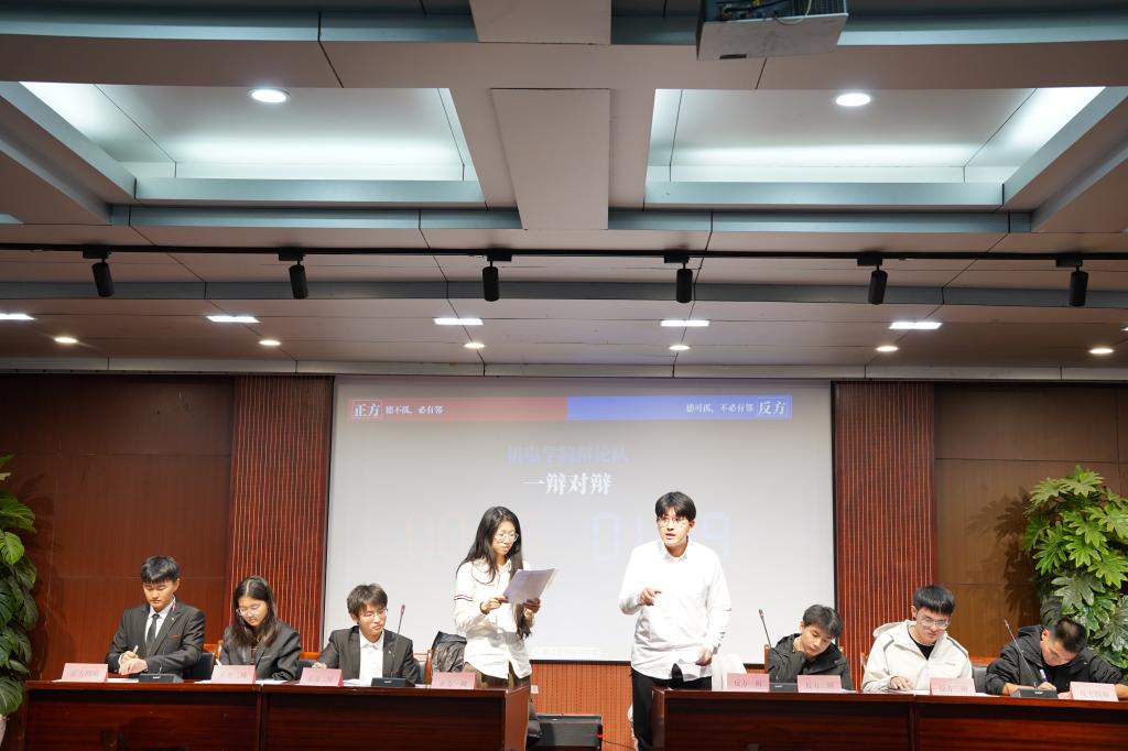 经过前期多轮激烈角逐,机电2025-2班与机电学院辩论队脱颖而出,共同角逐冠军荣誉。决赛围绕“德不/可孤,必/不必有邻”这一经典议题展开,双方队员开篇立论清晰有力,精准阐述己方观点。在自由辩论环节,双方选手据理力争,展现出极强的应变能力与思辨水平。在总结陈词环节,双方四辩凭借清晰的逻辑梳理能力与精准的观点提炼能力,为各自队伍的论证画上完整句号。