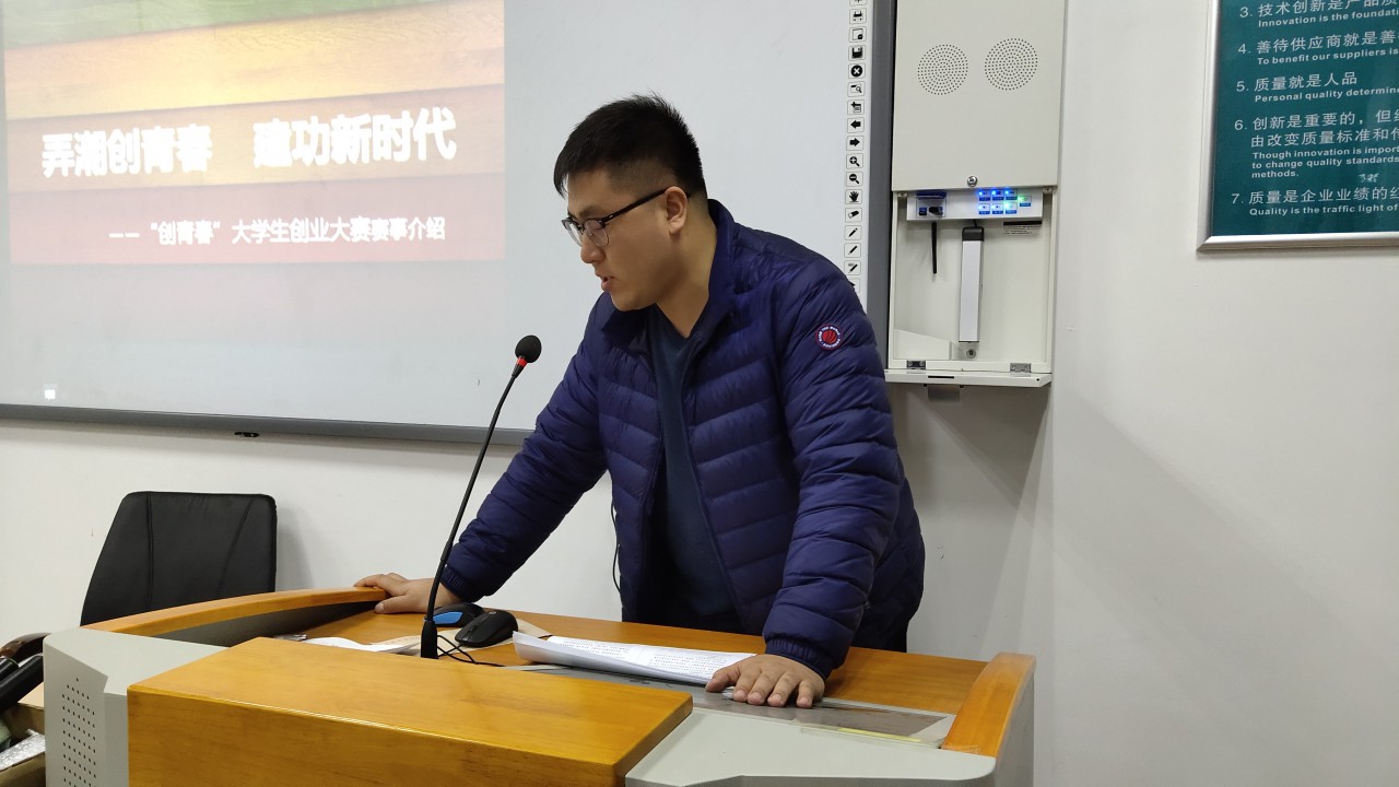 会上,陈老师从比赛基本方式、参赛资格与作品申报、我校立项、申报和参赛时间以及奖励等几个方面对“挑战杯”、“创青春”做了清晰详尽的介绍和解读,强调了大学生创新创业对祖国发展、社会进步的重要意义,他分享了自己指导学生参加比赛的经验,细致阐明了了创新创业类比赛应重视组建团队、利用资源等重要内容,号召同学们积极创新、敢于参与,做时代弄潮儿。