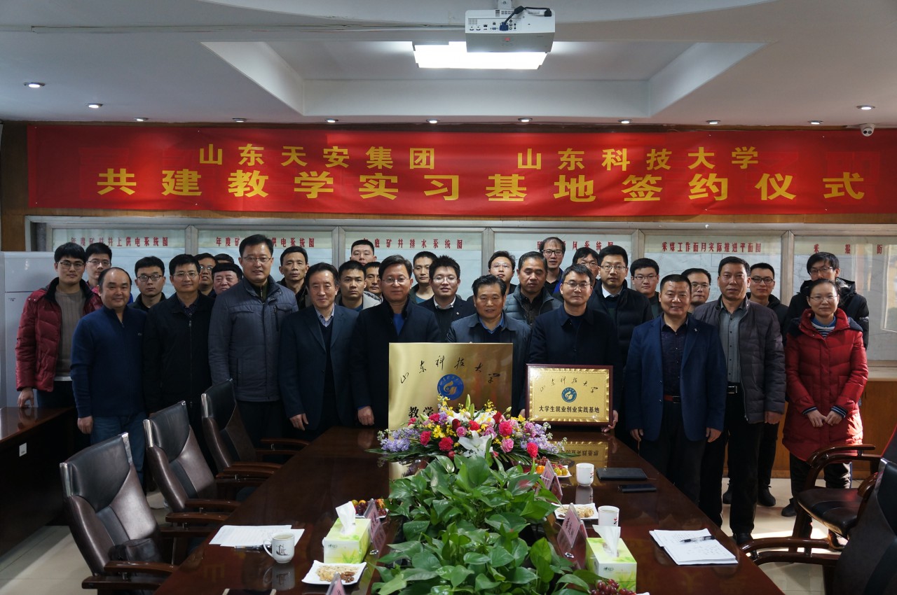 12月20日,山东科技大学创新就业实践基地、教学实习基地签约揭牌仪式在山东天安矿业集团举行。机电学院党委副书记、常务副院长韩宝坤,机电学院党委副书记、副院长苏超,山东天安矿业集团总工程师刘玉斌,山东天安矿业集团大统矿业公司杨庄煤矿矿长、机电学院92级校友郭锋,机电学院教师于岩、陈庆光、包继华等出席仪式,仪式由郭锋主持。