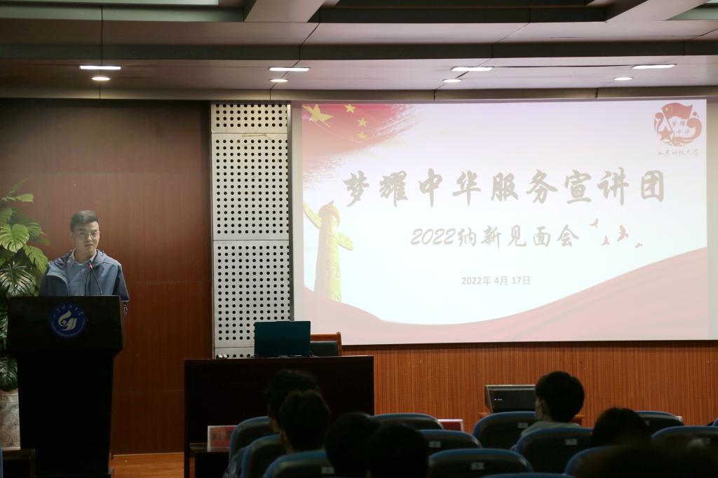 为了激发同学们参与社会实践的积极性,树立“在实践中奉献”的观念,4月17日-18日,机电学院梦耀中华服务宣讲团于学院楼报告厅举办2022年纳新见面会。机电学院团委老师苗成旭,梦耀中华服务宣讲团2019级队长杨忠源、刘璐璇出席会议。