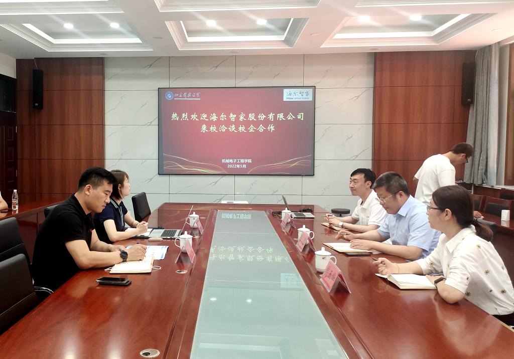 为进一步深化校企合作,共同搭建校企合作育人平台,拓宽毕业生就业渠道,5月27日上午,海尔集团来校开展创业训练营人才培养计划合作洽谈。机电学院党委副书记、副院长陈猛与海尔智家股份有限公司黄岛园区人力资源经理陈浩、招聘经理王欣在学院楼会议室交流校企合作事项,团委书记樊玉华、团委老师宋阔、学院2019级学生代表出席本次会议。