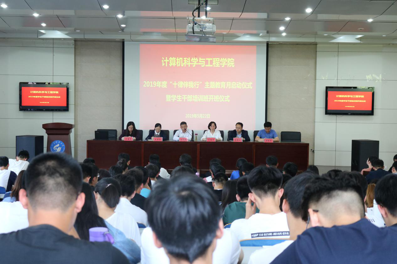5月22日16:00,计算机学院2019年度“十律伴我行”主题教育月启动仪式暨学生干部培训班开班仪式在蓝光报告厅举行,莅临本次启动仪式的领导有院党委书记牟仁刚,团委书记王春宇以及学院团委老师。