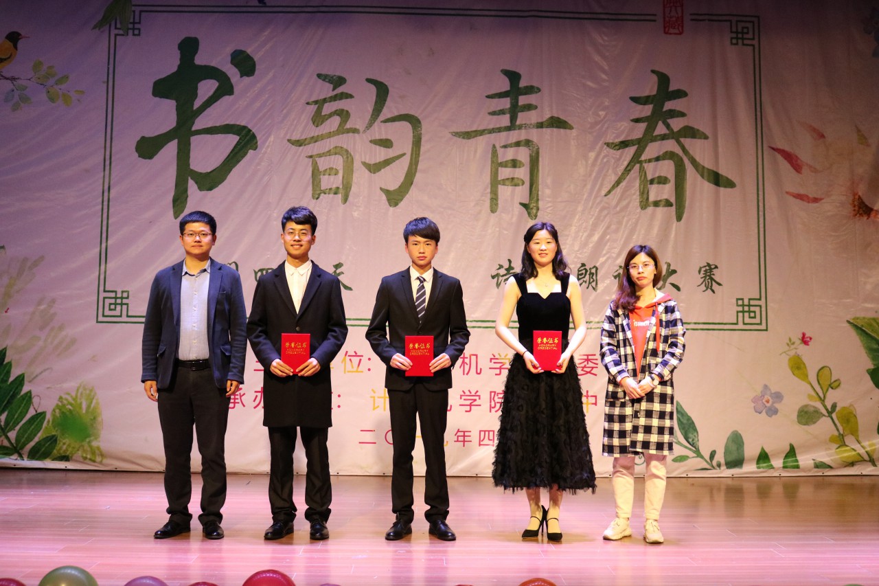 本次比赛设置“风采展示”和“自由朗诵”两个环节,共有八组选手脱颖而出进入决赛。NOB街舞协会受邀带来的开场舞《likely》迅速点燃了观众们的热情。风采展示环节,舞蹈、说唱,亦或是轮滑独秀,选手们以缤纷的表演和昂扬的精神面貌赢得了台下观众的阵阵掌声,也为参赛选手们接下来的自由朗诵环节做了精彩预告。最受关注的自由朗诵环节中,一段潇洒酣畅的《将进酒》带着大家穿越时空,煮酒论英雄;芳菲四月,《沂蒙花开》歌颂了沂蒙妇女支前的感人故事,让我们感受到革命年代先烈事迹的芬芳;烈日狂风雕刻的面庞,《致中国海军》告诉我们最可爱的人是何模样;青春的路途不平坦,《破茧成蝶》教会青年人永不言弃、挫折中奋起,用年轻的臂膀撑起民族的脊梁。还有《目送》、《闪耀吧青春的火花》、《宇宙银河里的我》、《青春·蝶韵》等一个个温情脉脉、细语人生的作品,讲述着意气风发、神采飞扬的青春故事。环节结束时,黄霄蓥同学带来二胡独奏《广德玄武》磅礴大气、意境深远,再次将大家拉入静若清泉和鸣,动若乾坤纵横的意境之中。比赛最终由苏泽、李天舒、纪飞、张珂柯(机电、材料、外国语学院)摘得桂冠;王一诺、孟繁颖(计算机学院),张川慧子(外国语学院)获得二等奖,侯利鹏(自动化学院),任媛媛、孙丽荣、王瑞雪、张玉泽、李佳瑞(计算机学院),孙凤祥、张长龙、司超越、尹玉洁(经管学院)获得三等奖,优秀奖由李丹丹、周娇娇(土建学院),谢立娟、范凯新(外国语、材料学院)获得;人气奖则由任媛媛、孙丽荣、王瑞雪、张玉泽、李佳瑞(计算机学院)和王一诺、孟繁颖(计算机学院)获得。