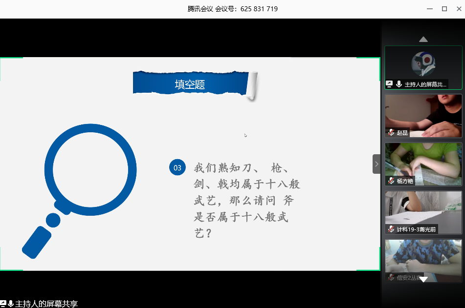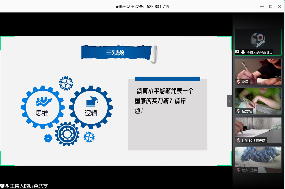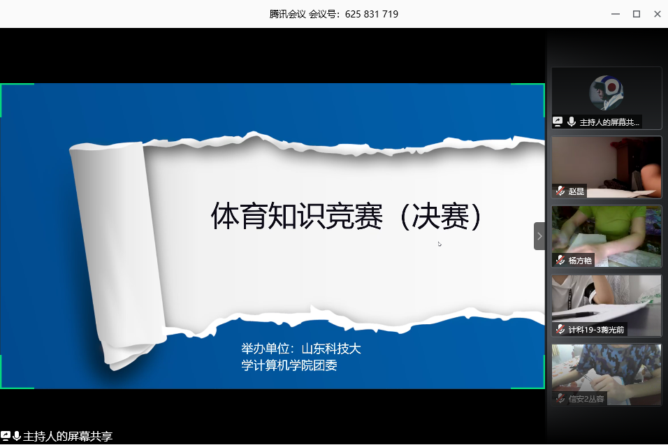 比赛充分运用网络的便捷功能,通过扫描二维码参与答题,题库随机,这充分考察了大家对体育知识的知悉程度。经过紧张激烈的答题比拼环节,共有七位选手进入决赛。决赛则采用的是实时线上会议,有选择题、填空题、主观题多种题型可选,这极大地丰富了比赛的精彩程度。经过激烈角逐,最终,网络工程18-2班李其祥取得本次竞赛的冠军,计算机19-3班蒋光前获得亚军,物联网19-1班杨方艳获得季军。