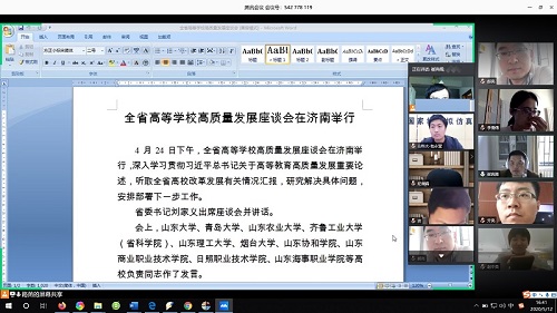 会议中,路燕书记带领大家集体学习了4月24日在济南召开的全省高等学校高质量发展座谈会相关文件精神。本次座谈会的主要内容包括深入学习贯彻习近平总书记关于高等教育高质量发展重要论述,听取全省高校改革发展有关情况汇报,研究解决具体问题,安排部署下一步工作。
